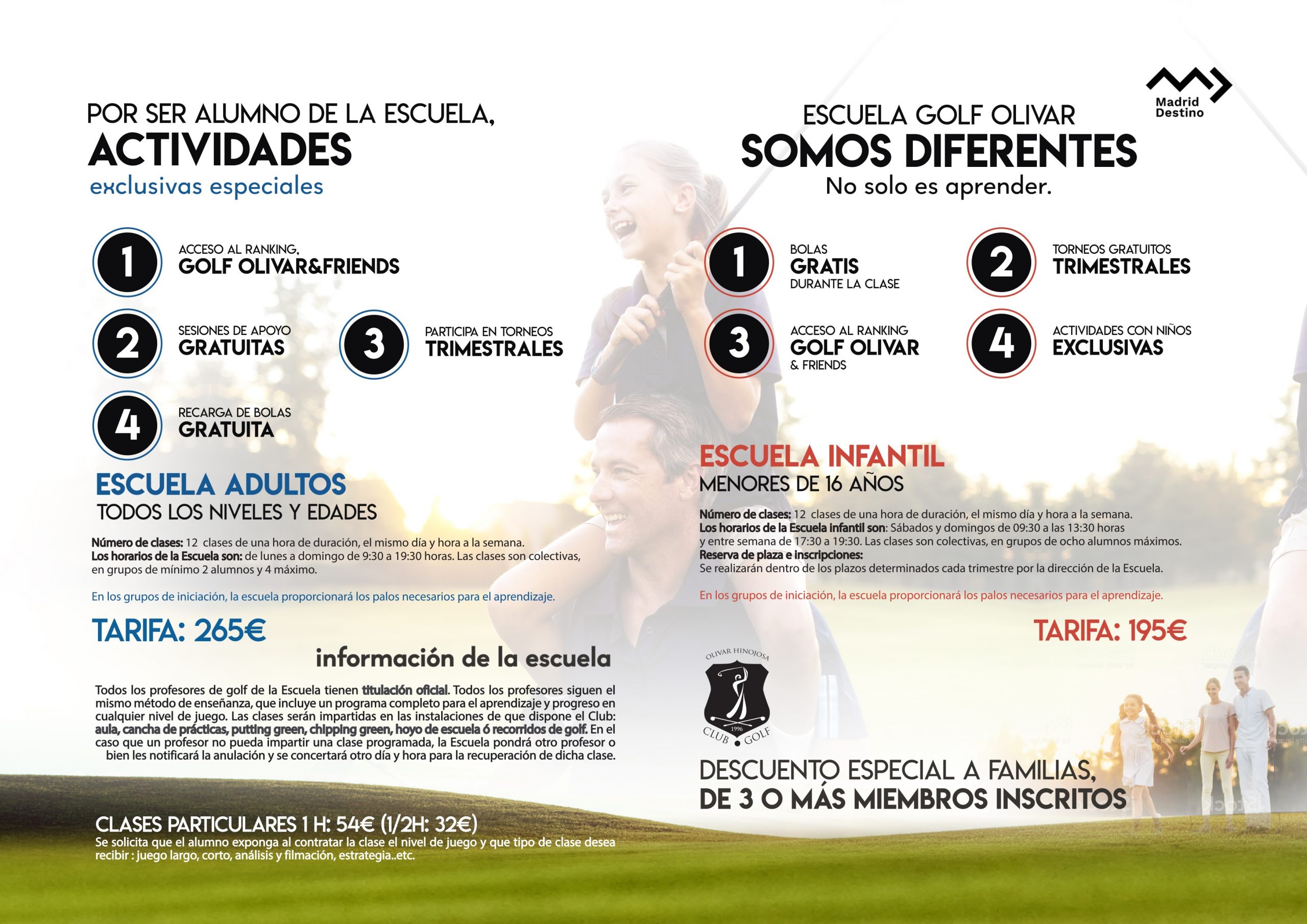 Presentamos nuestra escuela de golf, una escuela dotada de profesionales titulados. Todos los profesores siguen el mismo método de enseñanza, que incluye un programa completo para el aprendizaje y progreso en cualquier nivel de juego. Las clases serán impartidas en las instalaciones de que dispone el Club: aula, cancha de prácticas, putting green, chipping green, hoyo de escuela ó recorridos de golf. En el caso que un profesor no pueda impartir una clase programada, la Escuela pondrá otro profesor o bien les notificará la anulación y se concertará otro día y hora para la recuperación de dicha clase.